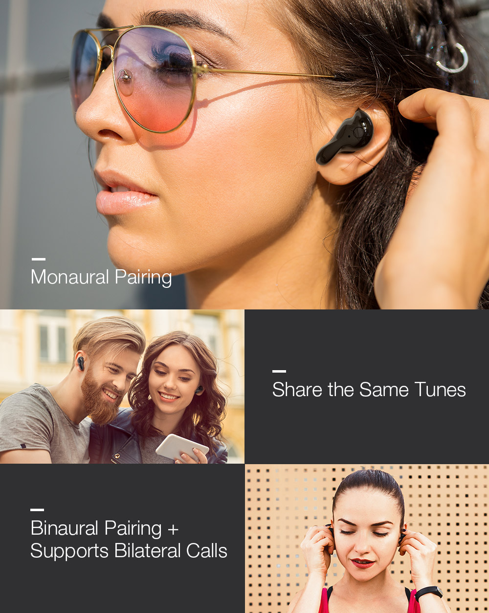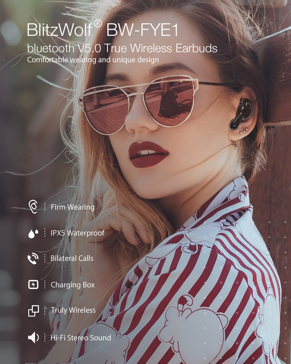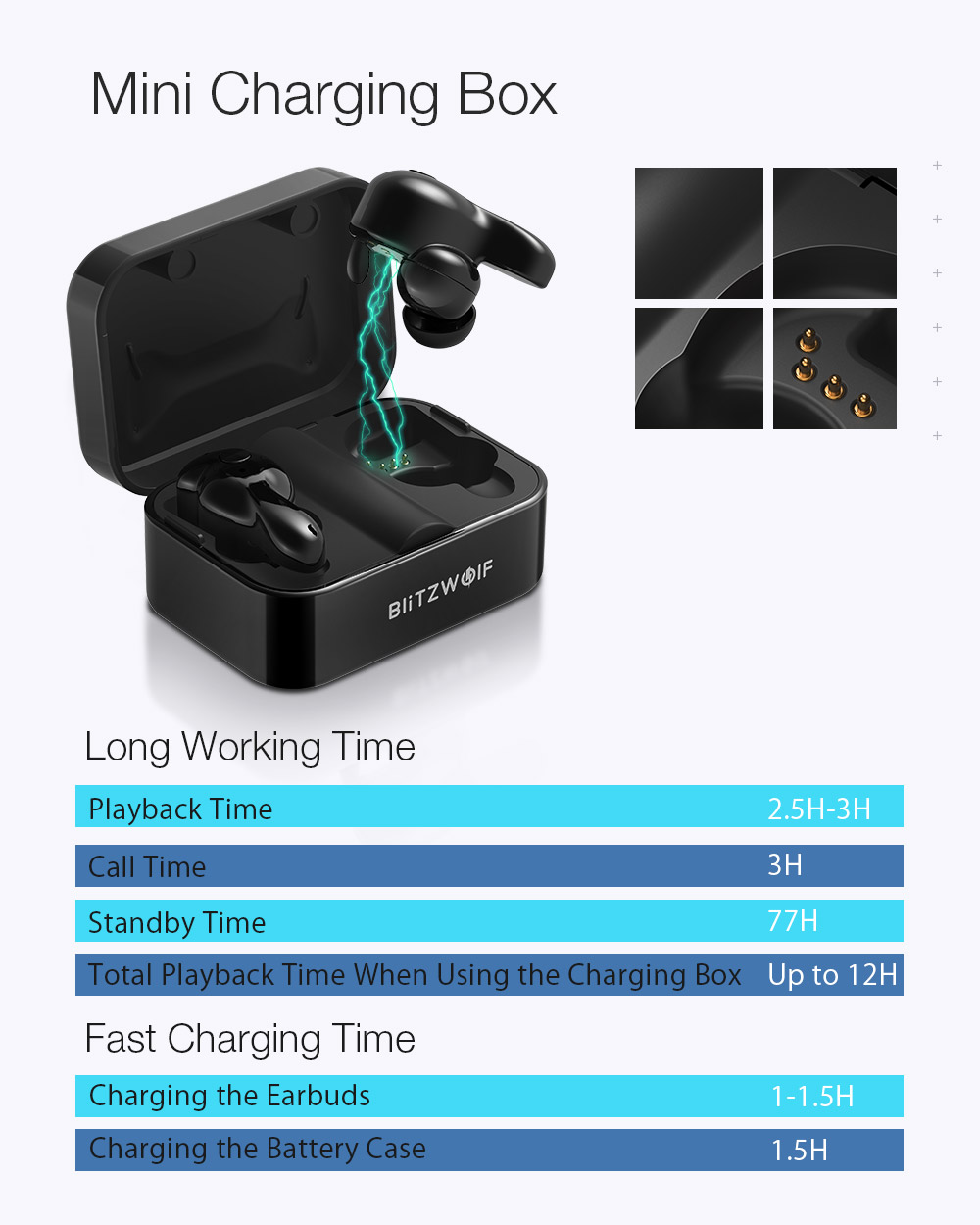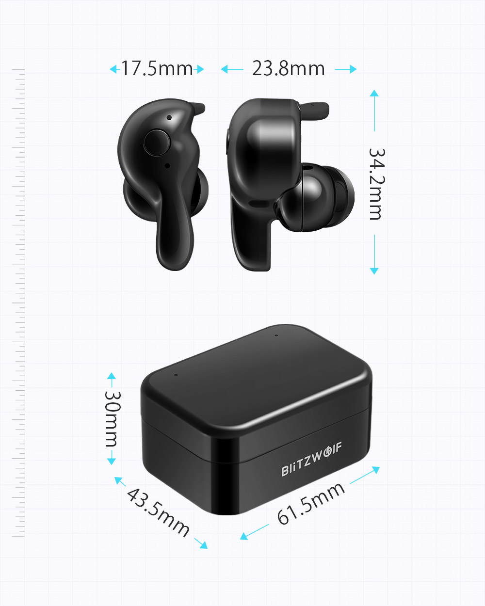 Modelï¼BW-FYE1 Mechanical Materialsï¼PC ABS Earbud Typeï¼Ear Hook Control Typeï¼Wireless Connection Bluetooth Versionï¼5.0 Transmission Distanceï¼≥ 33 feet (10m) Frequencyï¼2.4GHz, Class 2 Charging Box Output Voltageï¼DC 5.2V 120mA Charging Box Input Voltageï¼DC 5.2V 1A Temperature Rangeï¼0-45â Battery Capacityï¼Earbud: 50mAh/3.7V Polymer lithium batteryï¼ Charging Box: 700 mAh/3.7V Polymer lithium battery Charging Timeï¼Charging the Earbuds——1-1.5Hï¼ Charging the Battery Case——1.5H Music Timeï¼Monaural Earbud with Full Electricity——2.5H-3Hï¼ Consuming All the Electricity of the Charging Box——Up to 12H Call Timeï¼3H Standby Timeï¼77h Dimensionï¼Charging Box——61.5 X 43.5 X 30mmï¼ Earbud——34.2 X 17.5 X 23.8mm Weightï¼Single Earbud——6.25gï¼ Charging Box——47.5gï¼ Total Weight——60g